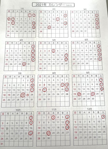 2021年の休業日をお知らせいたします。